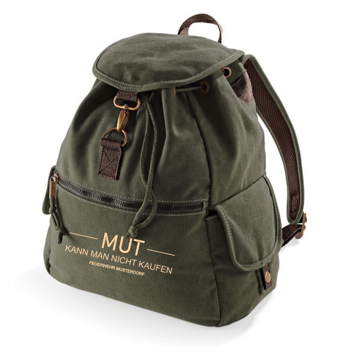 Rucksack, vintaged mit Aufdruck MUT KANN MAN NICHT KAUFEN und Feuerwehr mit Ortsnamen
