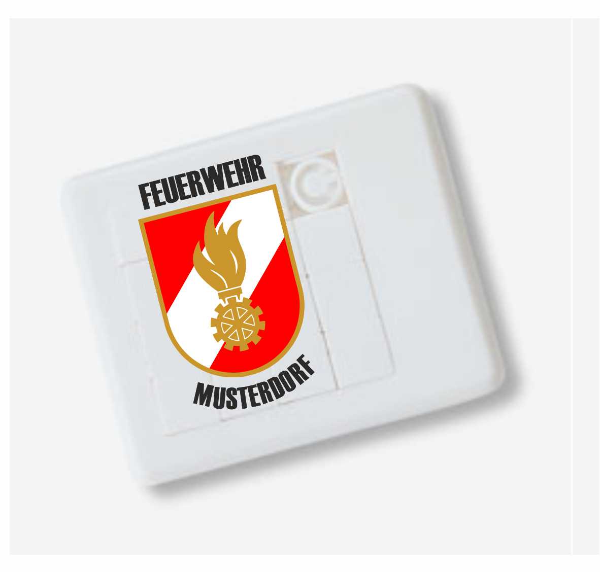 Schiebepuzle, weiss mit Aufdruck Feuerwehrlogo und Ortsname